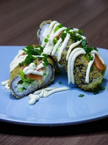 сыр, огурец, лосось, гребешок, соус терияки, соус спайс, криспи лук