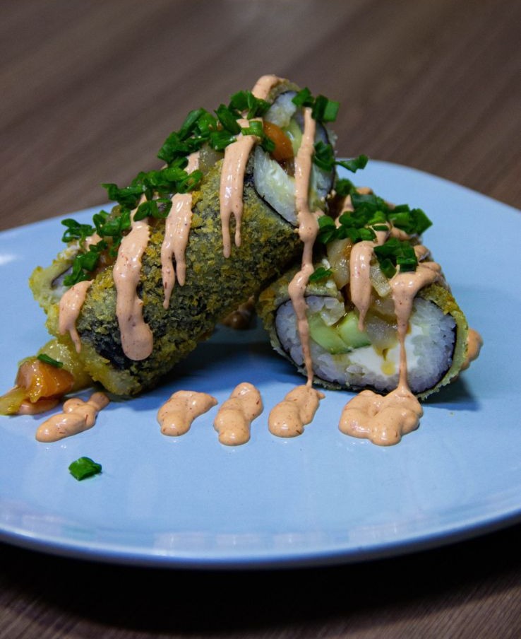 сыр, огурец, лосось, гребешок, соус терияки, соус спайс, криспи лук